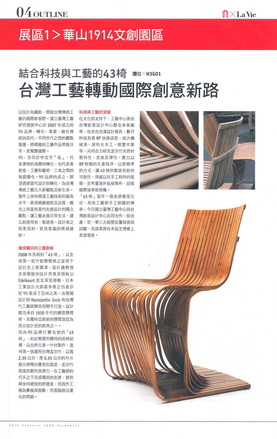 由43 條竹片構成的竹製懸臂椅「43」,以優美的姿態展現台灣孟宗竹高度的韌性與彈性,自2007 年在國際舞台亮相後,為台灣工藝品牌「Yii」打響名號。43椅誕生的源自2014 年,在文化部指導與工藝中心的協助下,台灣創意設計中心整合模具設計(浩漢設計)、科技RP 快速成型技術(數可科技)、機械回彈與應力技術(成大機械)、曲木加工與竹材特性加工技術(屏科大木工設計),擁有40 多年經驗豐富的大型曲木製造商(德豐木業),共同研究孟宗竹天然材質特性,並依其彈性、應力以RP 制模的生產程序,突破以往的瓶頸讓43 椅的製造有新的可能性,開啟國際接單新契機。